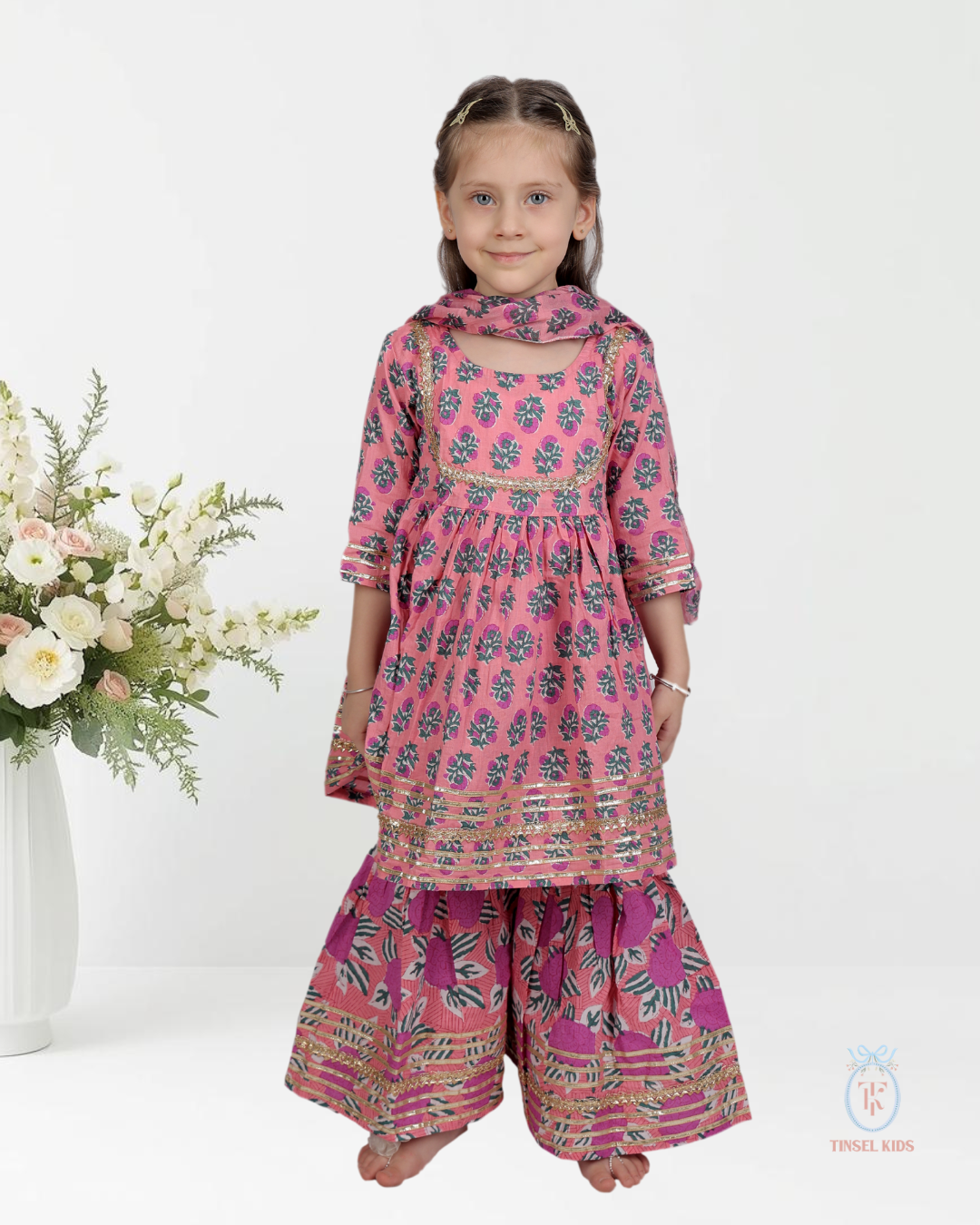 She twirls into the room like a little garden breeze, wrapped in blooming handblock florals...